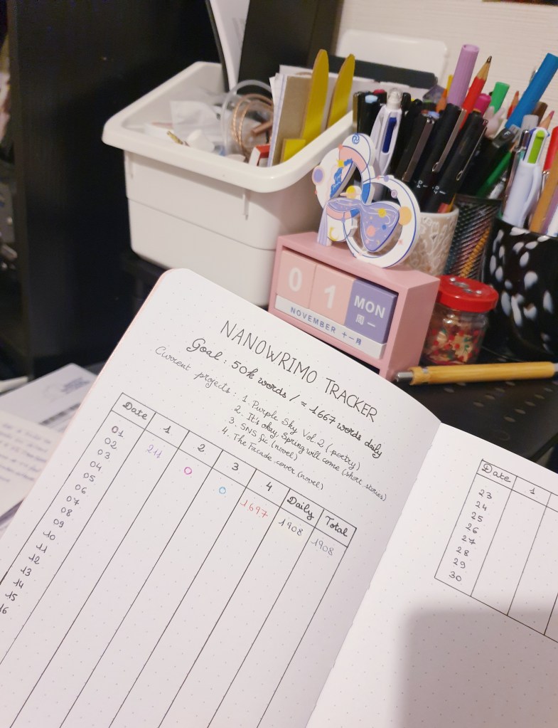 On NaNoWriMo’s official website where you can register for free, you can only select one project for the challenge, which is sad, really. But with this homemade tracker, I can do the challenge while working on all of my projects.