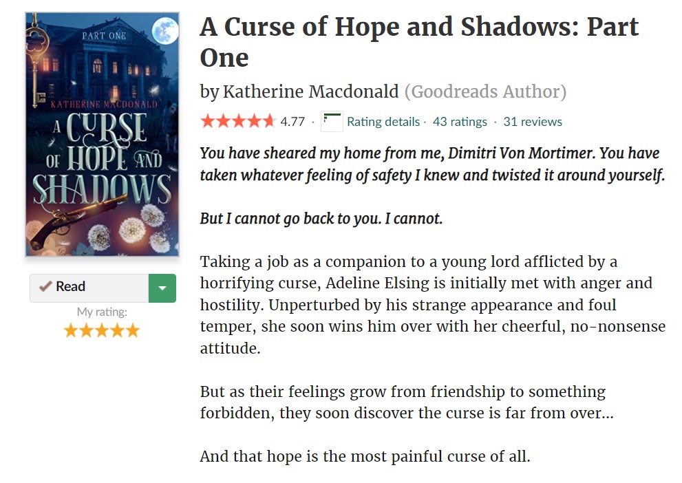 A Curse of Hope and Shadows, part 1, by Katherine Macdonald (Link)