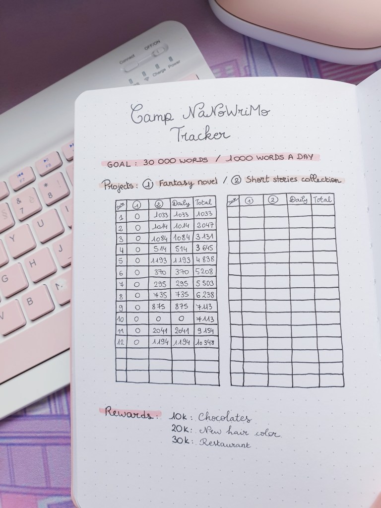 Just like for the last NaNoWriMo, I’ve made a little tracker in my bullet journal, and I still love it. It’s a very simple yet effective way to track your progress. I’m not a big fan of NaNoWriMo’s website, so yeah.